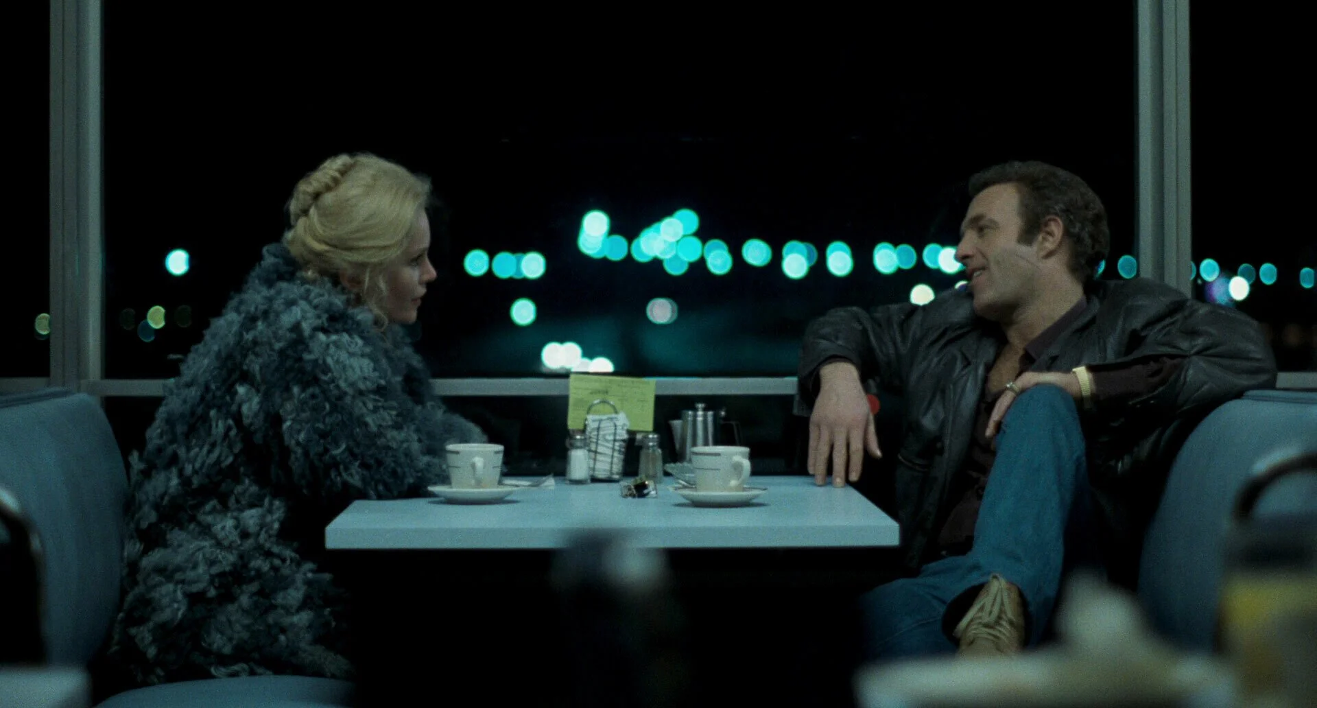 Every detail in this movie is thought out to be as moody and dramatic as it can possibly be. The pouring rain during the first heist at the beginning; neons acting as a criminal activity signpost, but also as a guiding light in the otherwise pitch black night (I love the scene where Frank and Jessie talk in a diner, all blued out by the neons outside); the cold and impersonal man vs machine scenes where Frank takes down seemingly impenetrable safes by sheer force. It never feels like you’re watching what really happened.