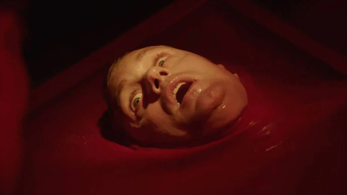 James realizes this in a brilliant scene, where he believes that he's torturing a hooded Li Tolqan official when it's revealed that he's just beating up another clone of himself paid by his decadent friends who are most likely clones of their former, more humane selves as well. Brandon Cronenberg also brilliantly illustrates this through the psychedelic drug scenes, where the decadent vacationers become one pile of horny flesh. The mechanics of James' nightmare are inexorable, but he seems like the only party not enjoying himself.